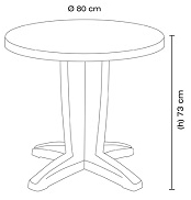 Стіл круглий Bravo компактний і функціональний, призначений для зручного розміщення трьох осіб. Його можна встановити на території садової ділянки, на відкритій терасі літнього кафе. Гладка глянцева поверхня стільниці та ніжка витонченої форми надають виробу особливий шарм. Стіл міцний і стійкий, в конструкції ніжки передбачено регулювання висоти. Є отвір з заглушкою для установки парасольки. Виріб виготовлено з поліпропілену, матеріал стійкий до дії низьких і високих температур, вологи, УФ-випромінювання. Призначений для використання в житлових приміщеннях, громадських місцях (літні кафе, бари), на вулиці. Стіл поєднується з будь-якими стільцями Papatya Bravo.
