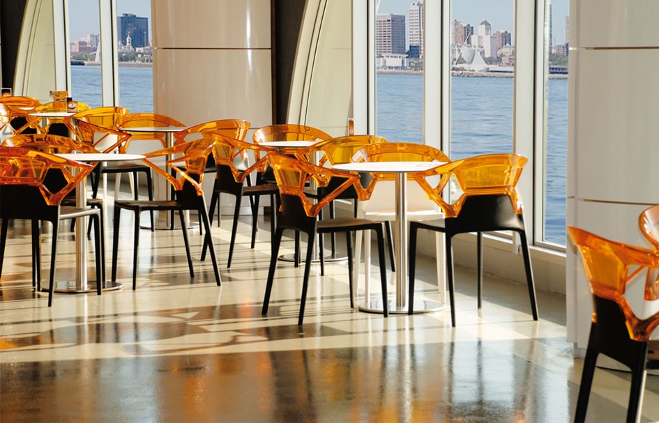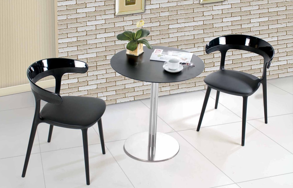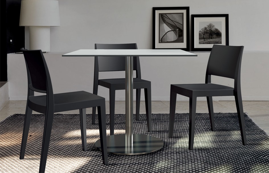 Надійний та міцний стіл. Залежно від вибору матеріалу ніжки він може використовуватися на відкритому просторі, наприклад, з нержавіючої сталі.